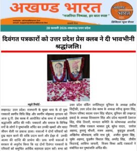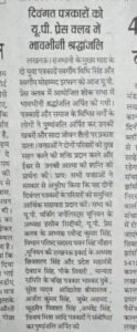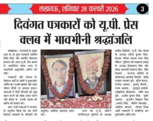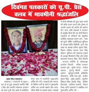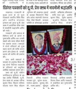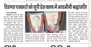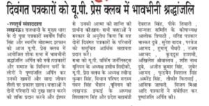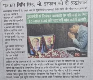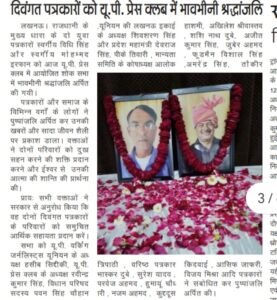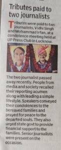 लखनऊ। राजधानी के मुख्य धारा के दो युवा पत्रकारों स्वर्गीय विधि सिंह और स्वर्गीय मोहम्मद इरफान को आज यू.पी. प्रेस क्लब में आयोजित शोक सभा में भावभीनी श्रद्धांजलि अर्पित की गयी।